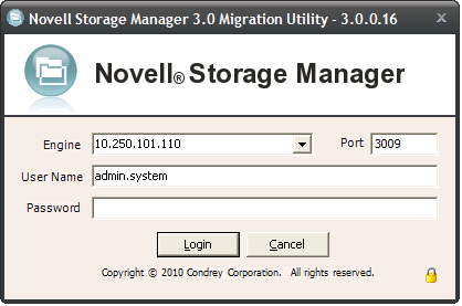Log in to the server hosting the Novell Storage Manager 2.5x NSM Engine by specifying the server’s DNS name or IP address in the field, specifying the port number, administrator name, and password, then clicking .