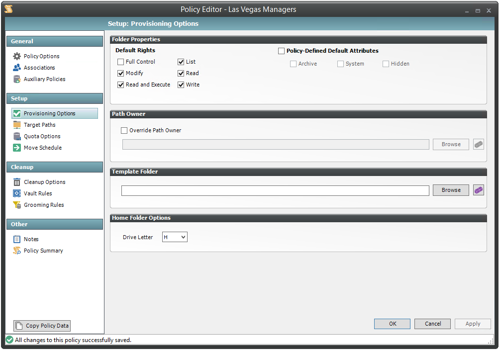 Policy Defined Default Attributes: Select this check box to enable the Archive, System, and Hidden check boxes, which provide the user the ability to set these attributes for the home folder. For example, if you wanted home folders to be hidden from view, you could enable the Hidden attribute by selecting the Hidden check box.