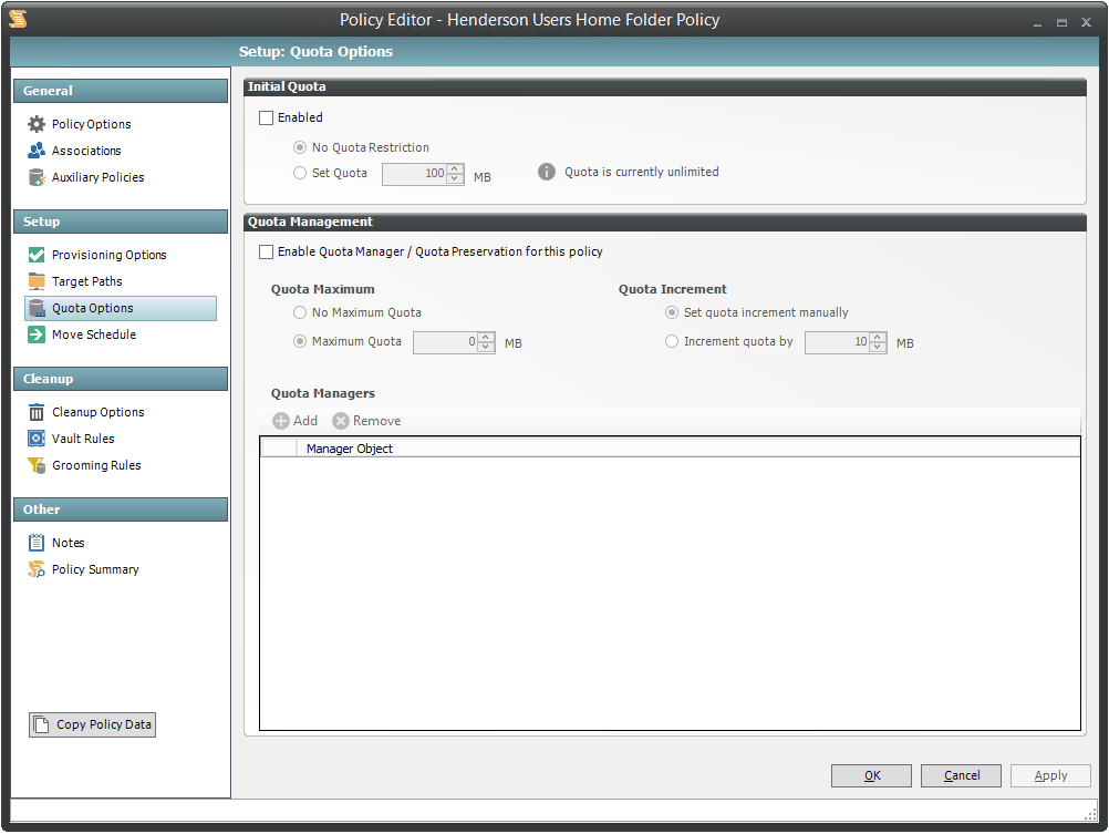 Quota Maximum: Indicate whether the user home folders associated with this policy will have a maximum quota setting. If so, indicate the maximum quota.