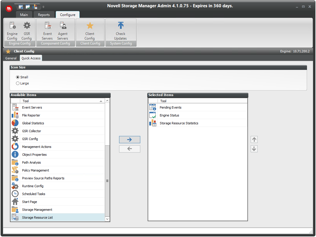 This page lets you access the items you use most in NSMAdmin from the Quick Access Toolbar. Items can be added or removed from the Quick Access Toolbar by right-clicking the item from its location in the interface, or through the Quick Access page shown below.