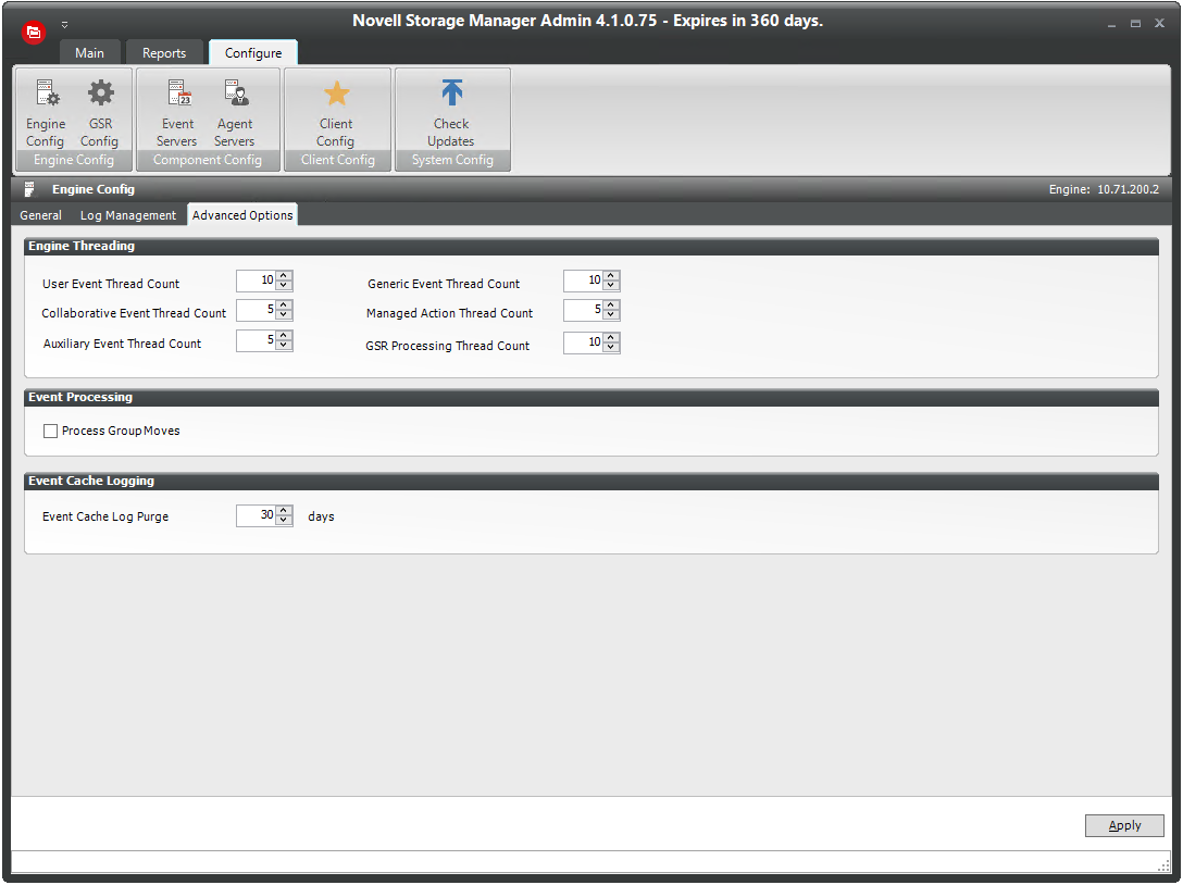 Event Cache Log Purge: By default, Novell Storage Manager keeps the most recent 30 days of event entries in cache. You can adjust the setting in the Days field.