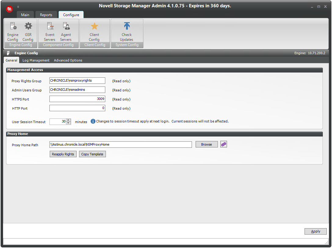 Copy Template: Clicking this button recopies files located in C:ProgramData\Novell\Storage Manager\Engine\data\ProxyHome to the location specified by the share. If the proxy home is not located on the server hosting the Engine, this makes it so you can recopy the template files without having to do it manually.