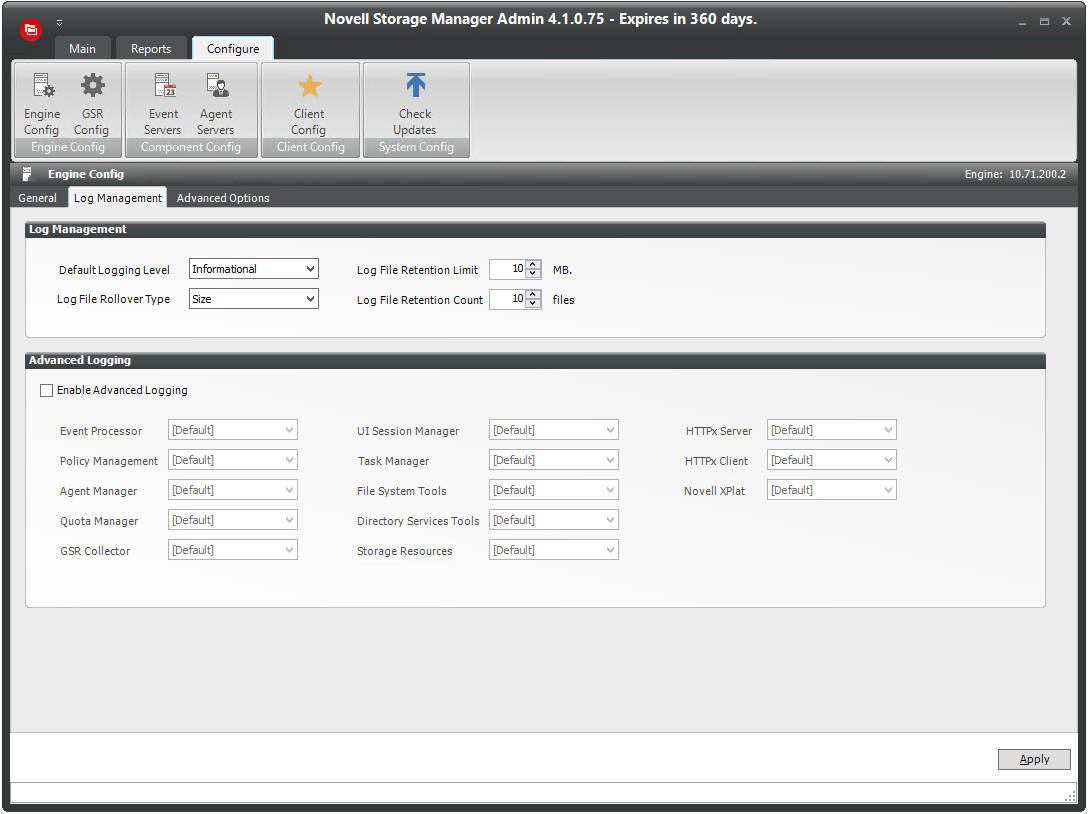 The Log Management tab includes settings specific to log files. Log files are accessible only from the server hosting the Engine at C:\ProgramData\Novell\Storage Manager\Engine\log.