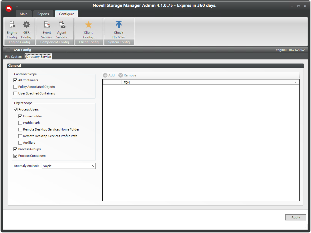 Policy Associated Objects: This option can be checked separately or combined with User Specified Containers for greater flexibility. This will cause the GSR Collector to enumerate and evaluate only objects that are associated to policies. After you have your objects managed by policy, use this option to limit the scope and provide meaningful anomaly analysis data for the objects that matter most.