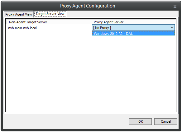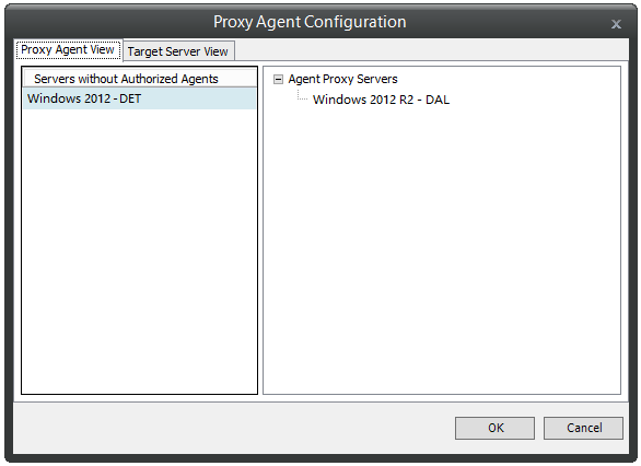 The left side of the Proxy Agent Configuration dialog box shows the list of servers without NSM Agents installed. The right side shows the servers with NSM Agents installed. In the example below, the Agent on Windows 2012 R2 - DAL could be set up to be the Proxy Agent for the Windows 2012-DET server.