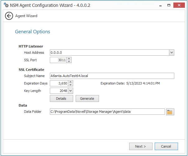 Data Folder: The default path of the Data folder. The Data folder contains application data needed by Novell Storage Manager.