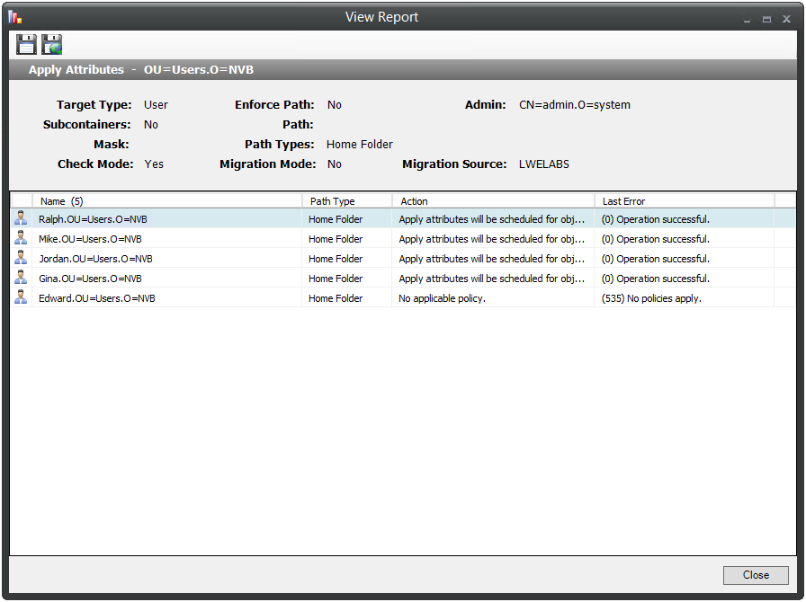 Action reports are stored each time a Management Action is performed. Use this page to view or export to a report, the results of any Management Action performed. A list of available Management Action reports is presented, identifying the report by the eDirectory object it was run on, and the time the report was generated.
