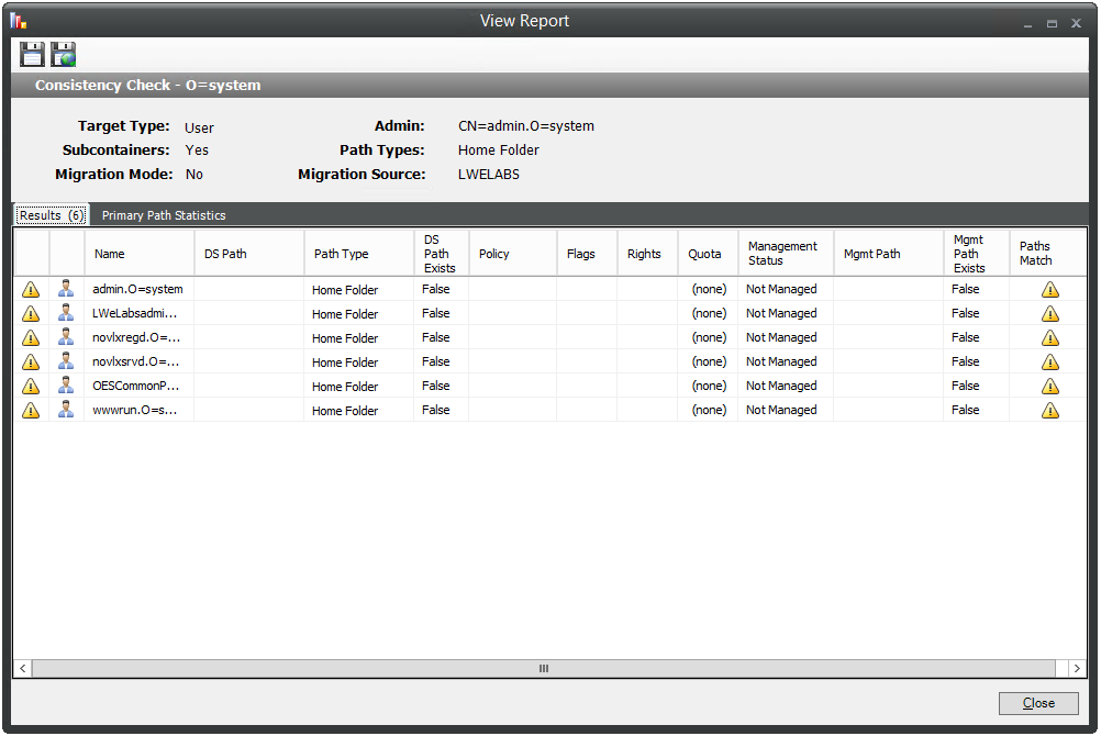 Lists objects in eDirectory whose managed path is populated with a value but are not managed through Novell Storage Manager. |