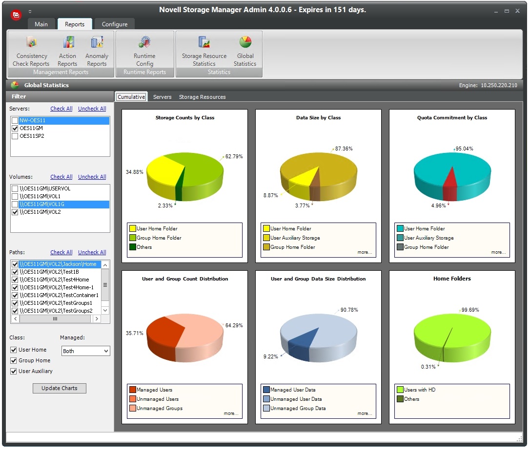 Global Statistics provides a graphic view of the current state of your storage. The reports can be configured to show different the servers, volumes and paths. The class (user, collaborative, or auxiliary storage) can also be selected.