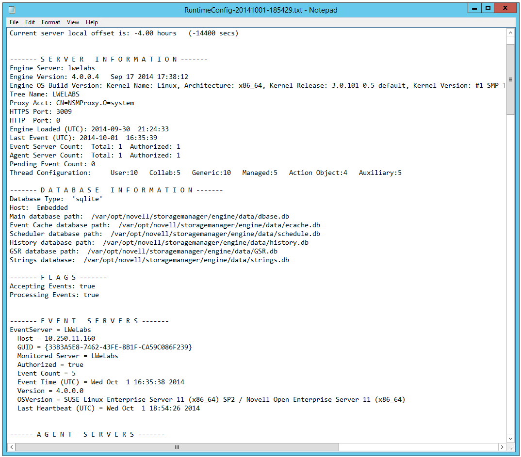The tab provides access to existing Consistency and Management Action reports for events and network storage. It also provides access to a Runtime Config report that reports on your Novell Storage Manager configuration, environment, and pending events.