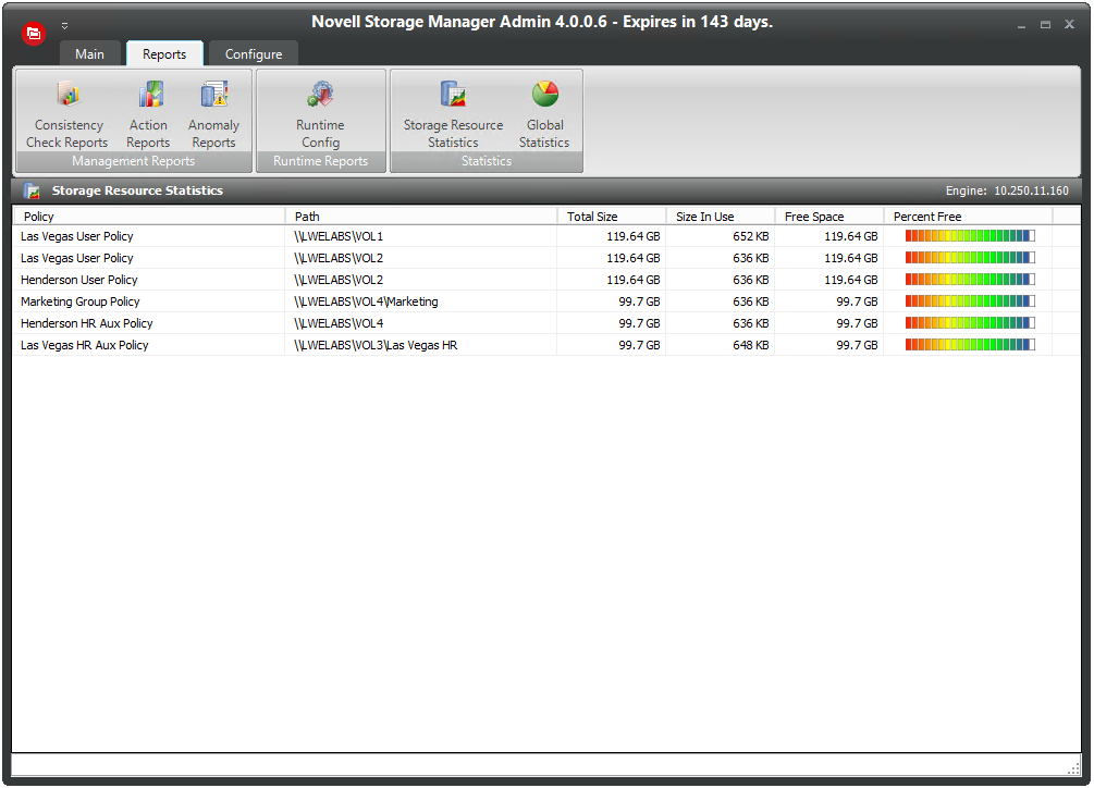 This page shows high-level statistical information pertaining to your policies, their corresponding target paths, and size and free space information.