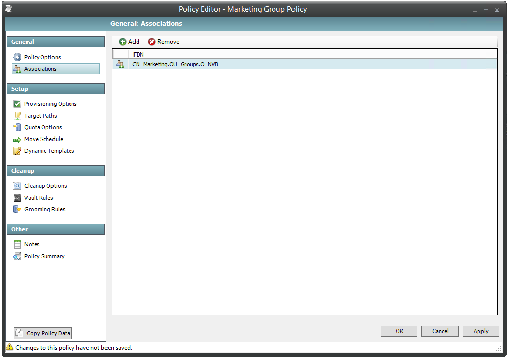After you assign a managed path, the next step is to create a collaborative storage policy for the group or container you selected in Step 5. In this procedure, the Collaborative Storage policy will apply to the Group object. However, a Collaborative Storage policy can apply to a Group's parent container thus making it applicable to all existing and new groups located therein.