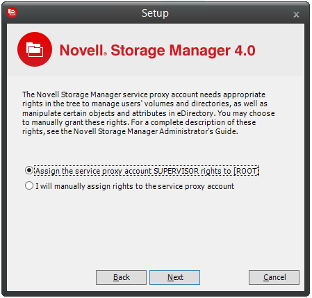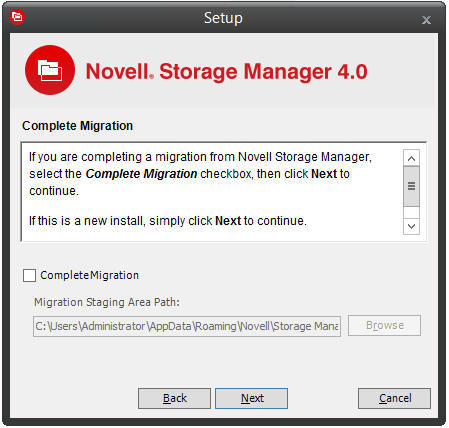 Because this is a new installation and not a migration from an earlier version of Novell Storage Manager, click .