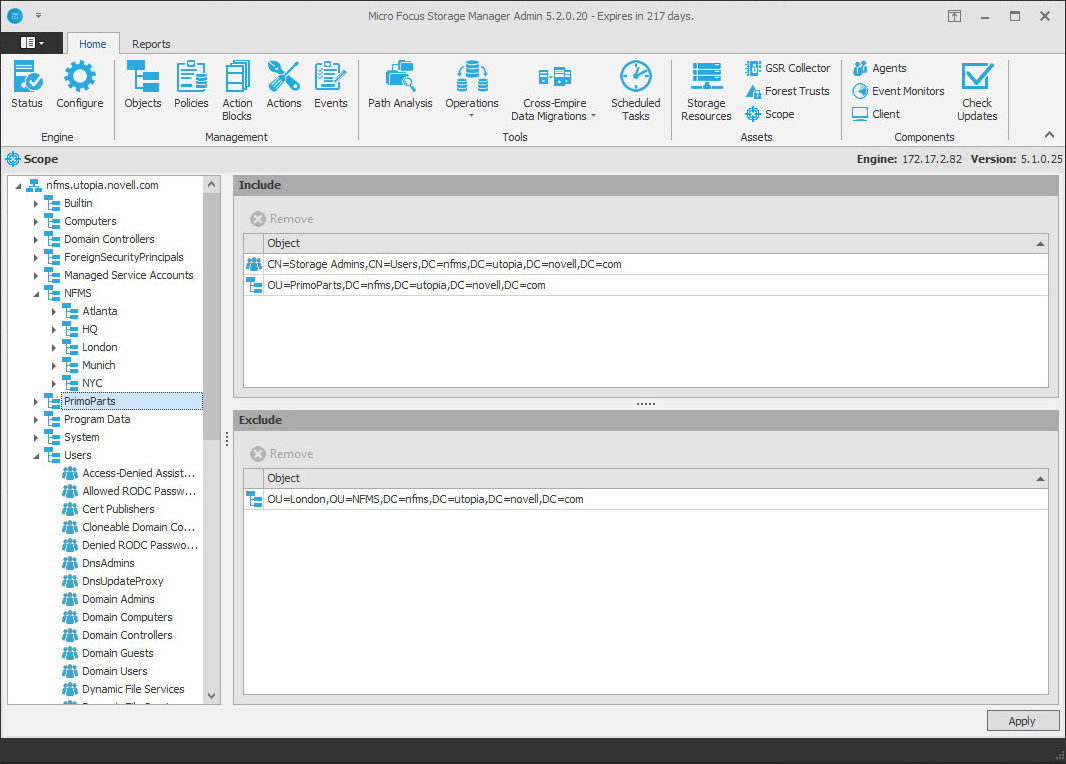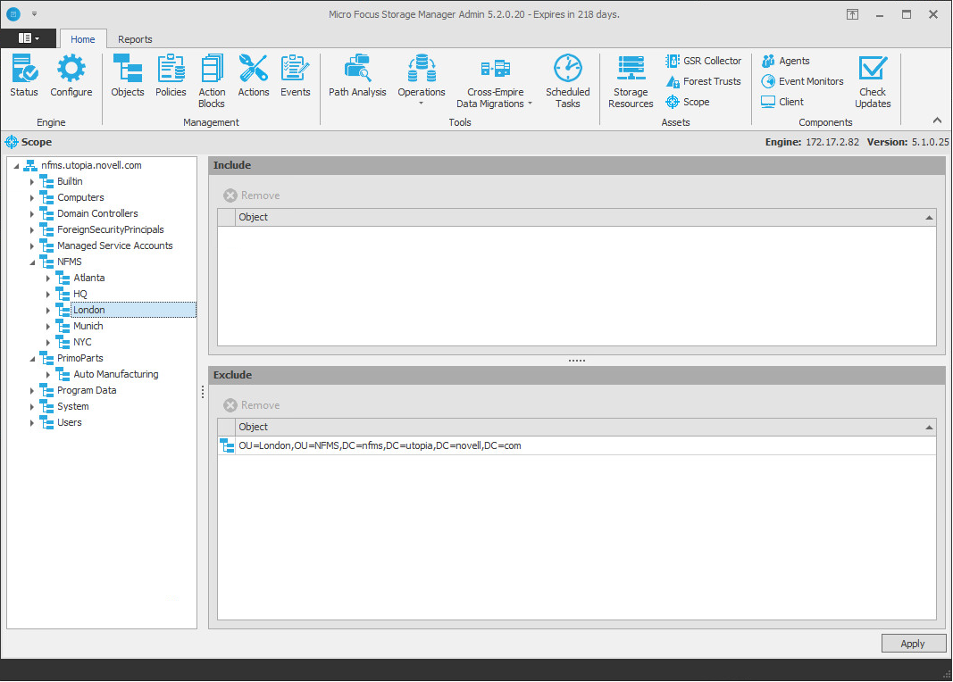 In the example in Figure 4-3, the Event Monitor will monitor the PrimoParts container and Auto Manufacturing subcontainer, and all of the subcontainers in the NFMS container, with the exception of London. It will also exclusively monitor the Storage Admins group and exclude all other groups.