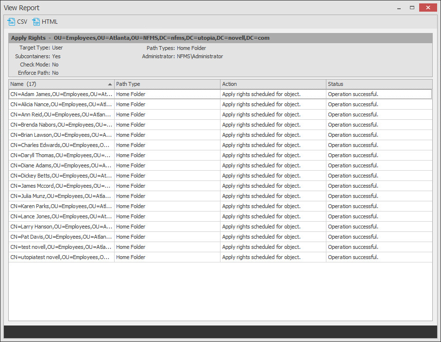 Figure 13-40 is an example of the Path Duplicate Value report. The Object FDN and Object SAM Account Name columns display the respective attributes. The Path column is the value of the homeDirectory attribute. The Path column contains the current respective path attribute value obtained from Active Directory. The Managed Path column does not have a value because these objects are not yet managed by Storage Manager. These objects are reported because they have the same value for their homeDirectory attribute. This report can be used to identify objects who erroneously share the same path for the respective path attribute.