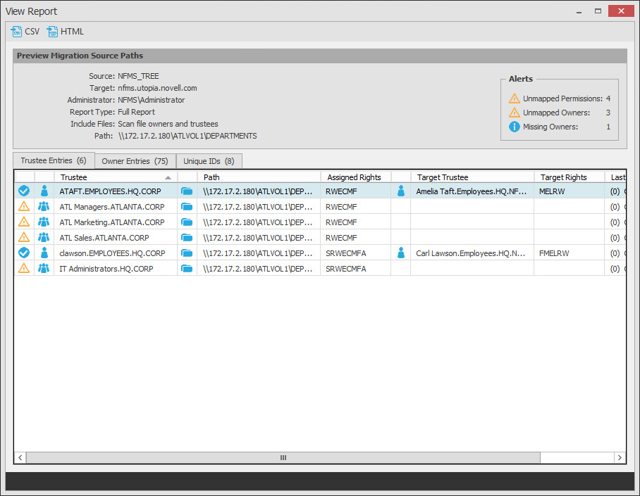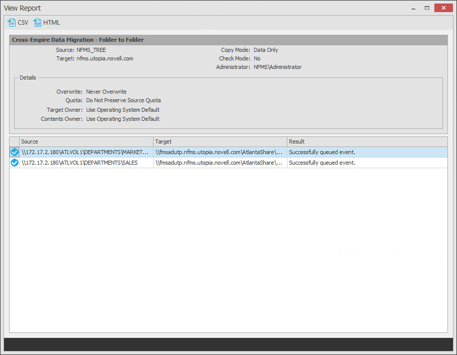 To export a Completed Cross-Empire Data Migration report, double-click a report listing to access the View Report dialog box, and then in the upper-left corner of the dialog box, click either the CSV or HTML icons.