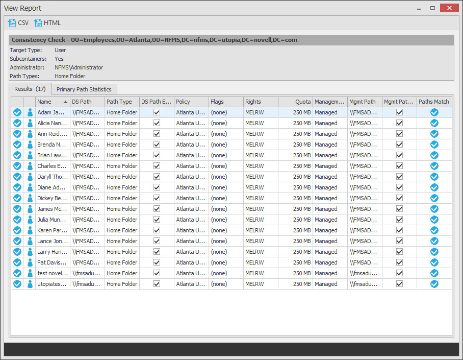 Figure 13-39 is an example of the Name Mismatch report. The Object FDN and Object SAM Account Name columns display the respective attributes. The Path column is the value of the homeDirectory attribute. The Path column contains the current respective path attribute value obtained from Active Directory. The Managed Path column contains the path value when the object was last managed. This object is reported because the leaf path name specified by its homeDirectory attribute does not match the sAMAccount name attribute. This report can be used to identify objects whose respective path might have been changed manually.