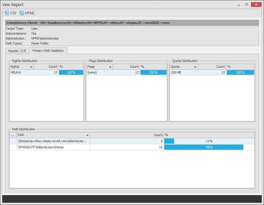 To export a Consistency Check report, double-click a report listing to access the View Report dialog box, and then in the upper-left corner of the dialog box, click either the CSV or HTML icons.