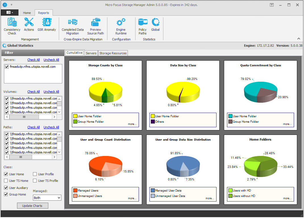 The reports can be configured to show different servers, shares and paths. The class (user, collaborative, or auxiliary storage) can also be selected. Expanding or stretching SMAdmin increases the size of the charts and the legend under each chart.