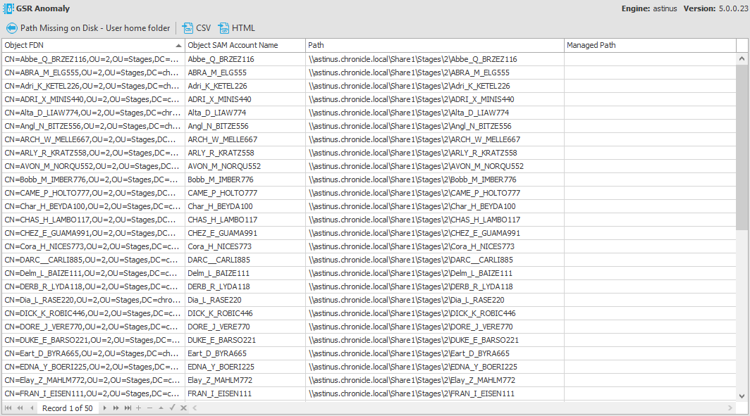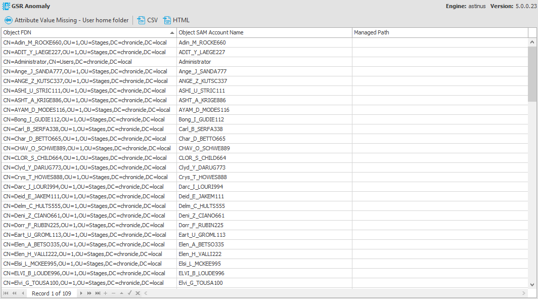 Figure 13-36 is an example of an Attribute Value Missing Anomaly report. The Object FDN and Object SAM Account Name columns display the respective attributes. The Managed Path column does not have a value because this object is not yet managed by Storage Manager. These objects are reported because they do not have homeDirectory attribute values. This report can be used to identify objects that should be managed. It can also identify objects that have had their respective path attribute cleared accidentally or erroneously by an identity management system.