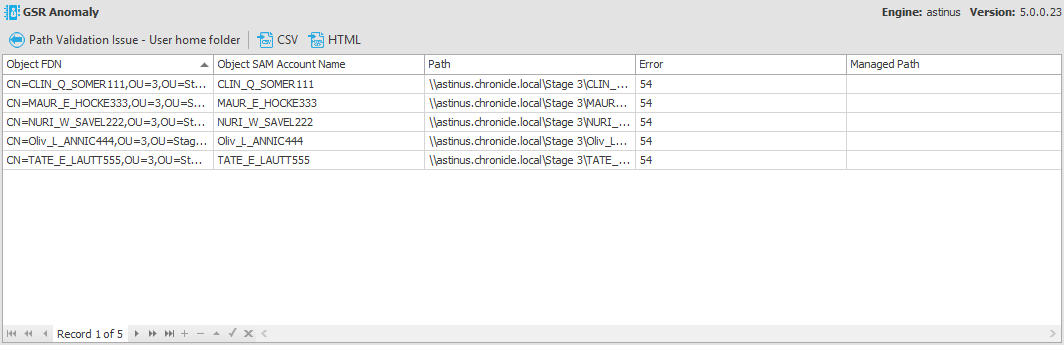 Figure 13-38 is an example of the Path Validation Issue Anomaly report. The Object FDN and Object SAM Account Name columns display the respective attributes. The Path column is the value of the homeDirectory attribute. The Managed Path column does not have a value because this object is not yet managed by Storage Manager. These objects are reported because there was an error when trying to verify the existence of the path specified by their homeDirectory attribute. This report can be used to identify objects whose respective path attribute value no longer exists at the specified location or if the Engine has an issue communicating with the server or share on which the path is located. The symptoms can be: