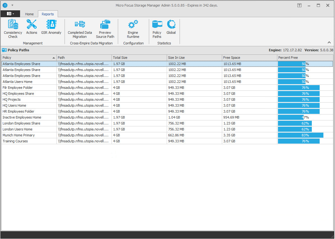 This page shows high-level statistical information pertaining to your policies, their corresponding target paths, and size and free space information.