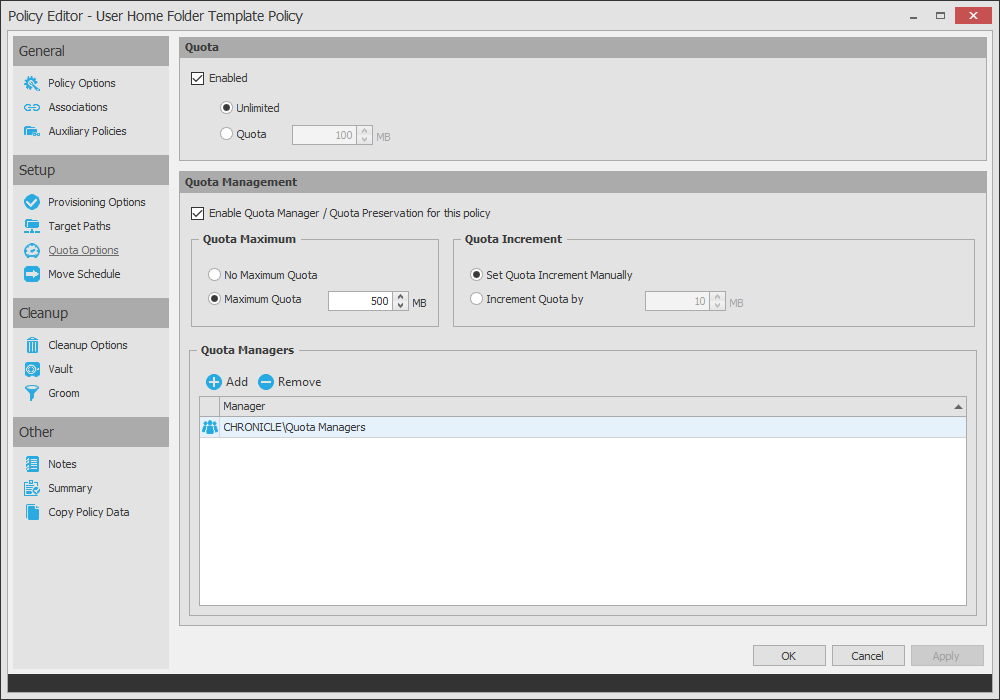 Using SMAdmin, verify that all of the policies managing the users for whom you want to manage quotas through Quota Manager have the Enable Quota Manager check box selected, with a Quota Maximum and/or Quota Increment setting.