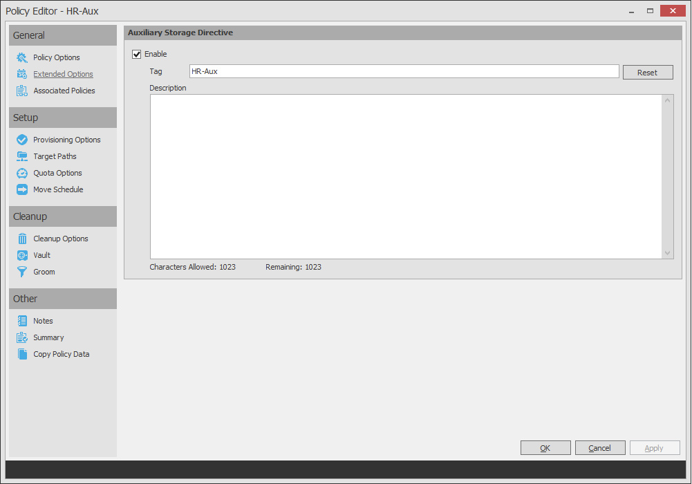 Figure E-1 Extended Options Page of an Auxiliary Storage Policy