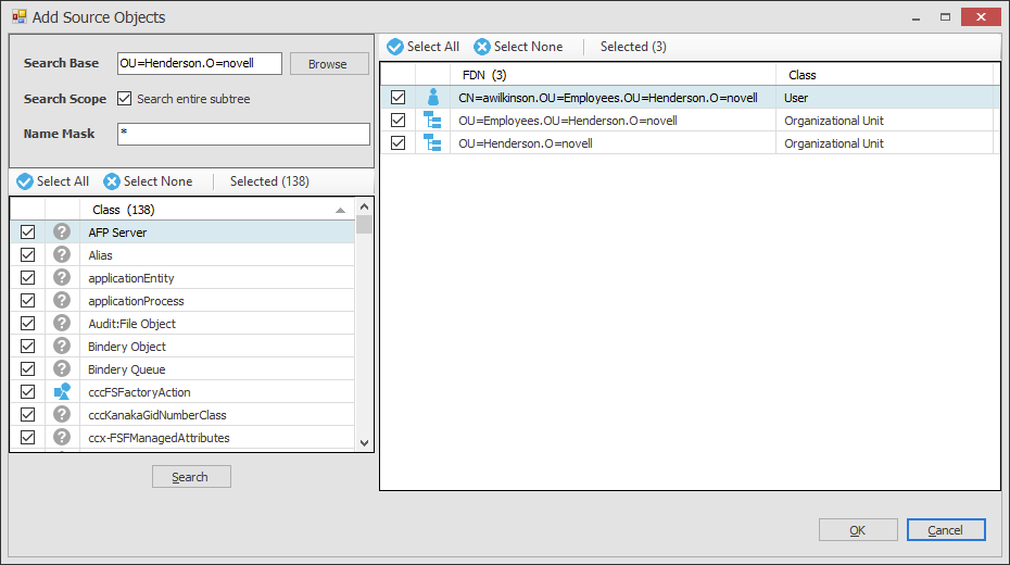 In the Add Source Objects page, use the Search Base, Browse button, Search Scope, and Name Mask fields to locate and select the container you want to use for your search.
