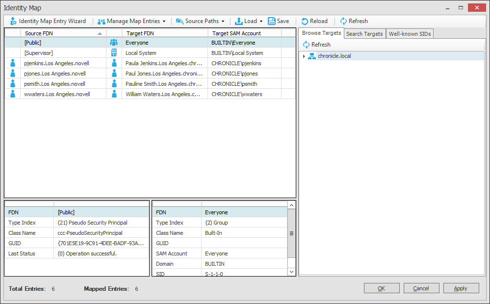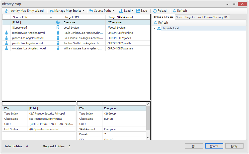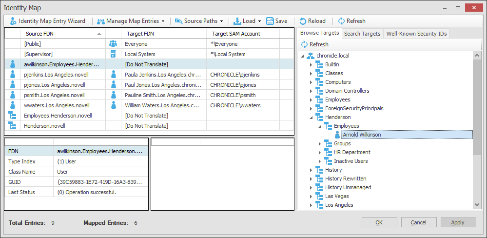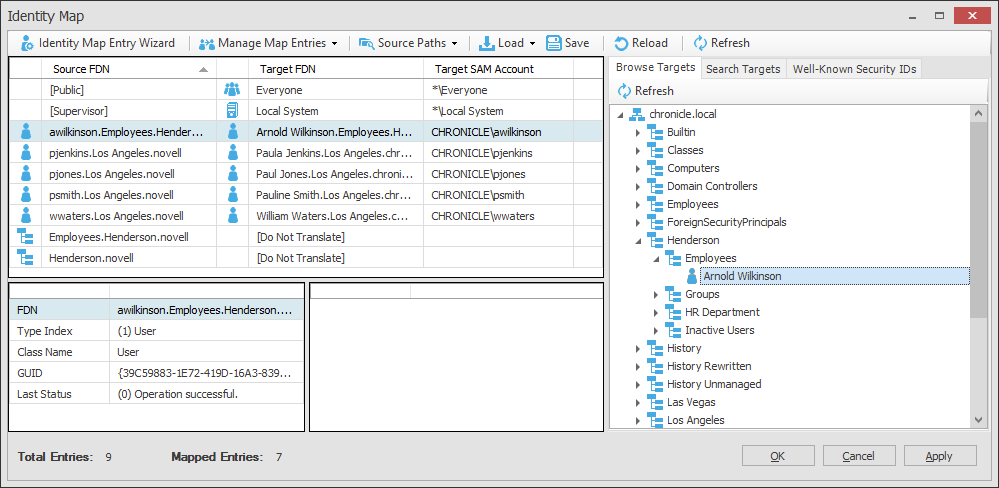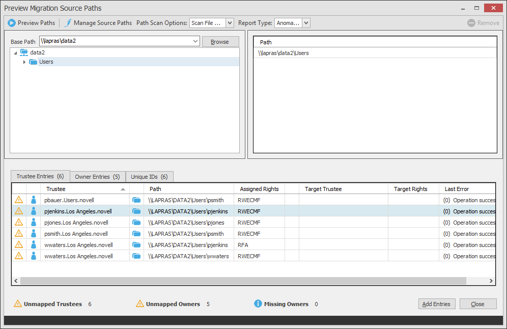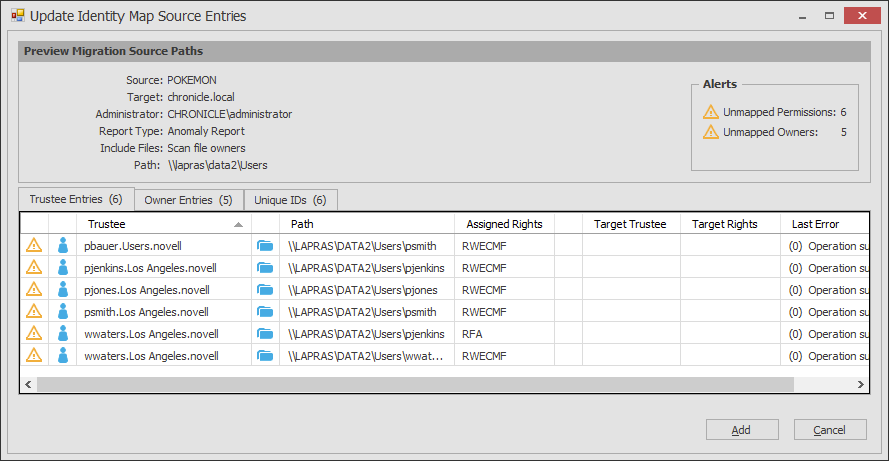 For example, in the graphic above, the Trustee Entries tab displays the source IDs that have a trustee assignment to a folder but a target ID has not yet been created in the identity map.