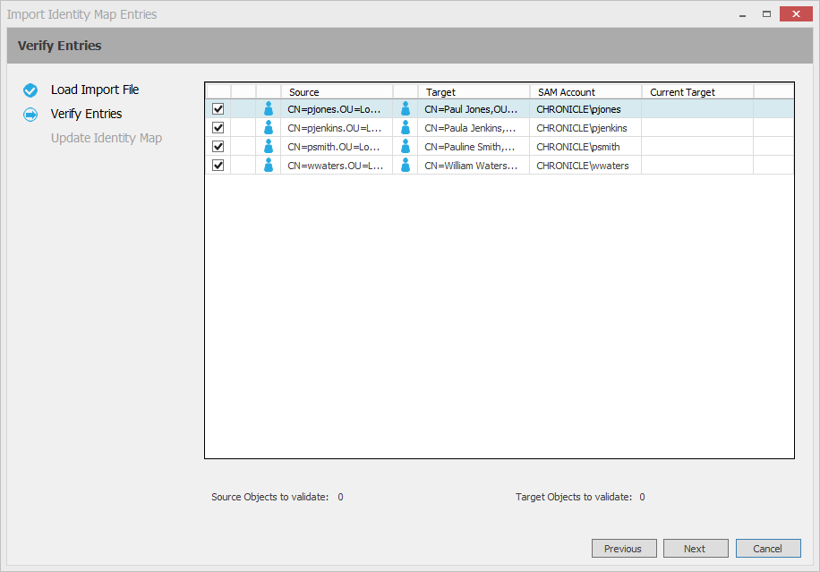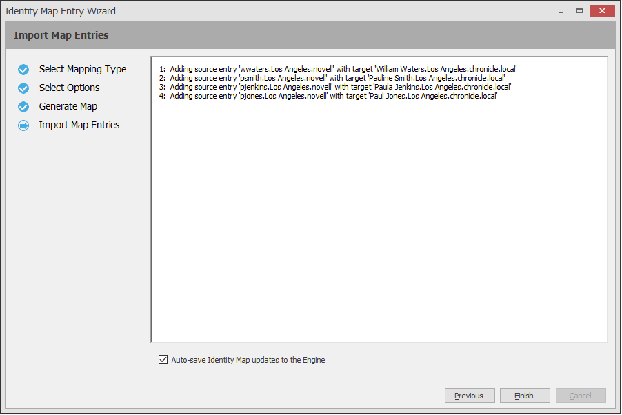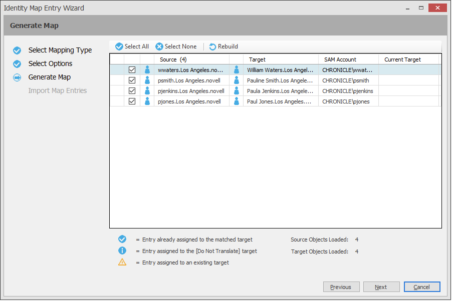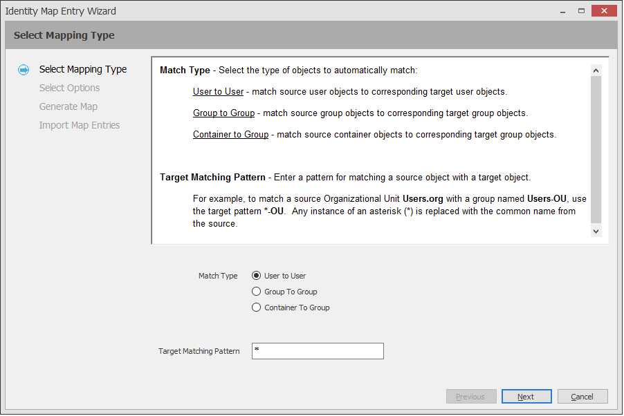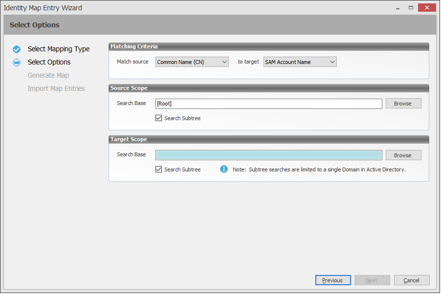 If you need to match using both account types on your target server, you can choose one option now and then run the wizard again and choose the other option. You might need to run the wizard multiple times in order to add all of the users, groups, and containers to the identity map.