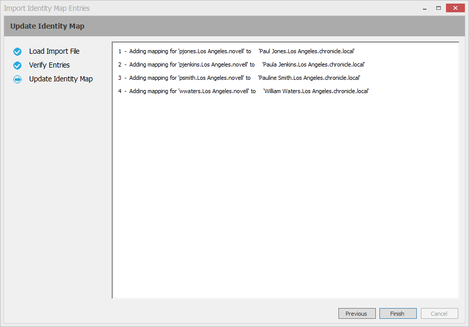 In Step 10, you added entries to the identity map by using the Preview Migration Source Path page’s Add Entries button. You can also use the Add Entries from Preview Report option to retrieve any preview report that you have generated for the directory tree you are working with, and add those entries to the identity map.