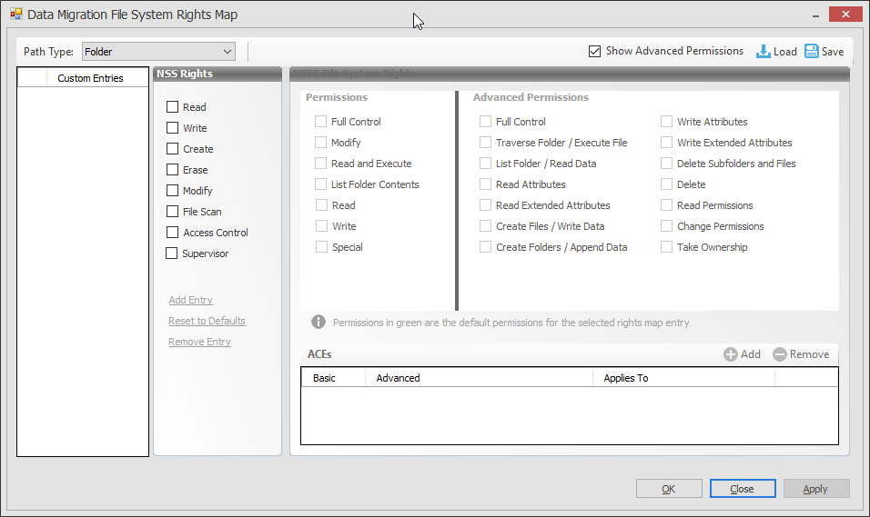 Despite the inherent differences in rights, trustee assignments, and permissions between Novell or Micro Focus and Microsoft networks, the Cross-Empire Data Migration subsystem of Storage Manager for Active Directory does its best to match the Novell or Micro Focus rights and trustee assignments with the equivalent Microsoft permissions and advanced permissions.