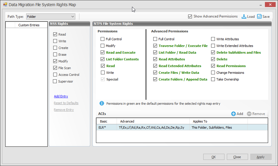 You can modify the rights mappings by using the File System Rights Map. When you do this, you specify a mapping between one particular set of rights on the Novell or Micro Focus servers to one particular set of rights on the Microsoft Windows servers. As an example, the default mapping is to map the Novell or Micro Focus NSS rights RWECMF to the Windows NTFS rights MELRW. As a further example, perhaps when files have this set of rights you do not want to grant the E (erase) right to files on the target. You could modify the mapping using the procedures below to change the mapping of Novell or Micro Focus NSS rights RWECMF to the Windows NTFS rights MLRW. When you do this, you change the mapping for every file that has that exact set of rights, but it does not change the E mapping in any other set of rights. For instance, if you had trustees that had RWCEF, that mapping would not be changed because you changed the mapping for RWCEMF.