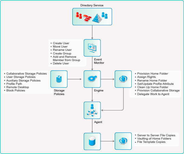 Policies within Storage Manager indicate what storage-specific actions to enact when an event in Active Directory takes place. These actions include creating user or collaborative storage when a new user is added to Active Directory, moving storage when a user is moved from one organizational unit or group to another, and archiving or deleting storage when a user is removed.