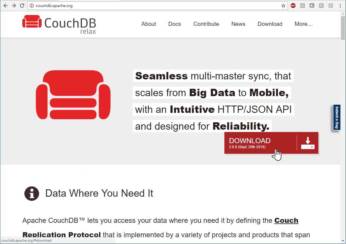 From couchdb.apache.org, download the platform version of Couch DB 2.0 for the server that will host the CouchDB database.