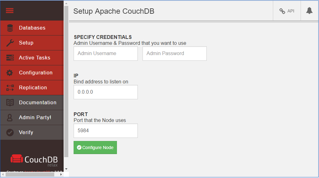 Specify a new administrator username and password, leave the IP address setting open, and leave the Port setting at 5984, then click Configure Node.