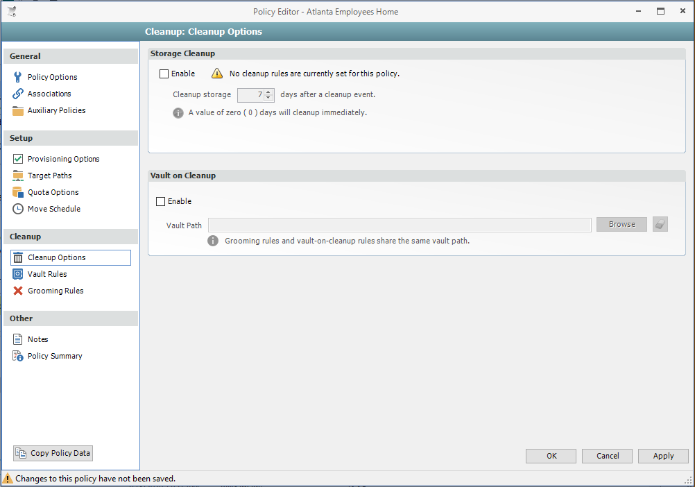 If you want user storage associated with this policy vaulted, in the Vault on Cleanup region, select the Enable check box and use the Browse button to indicate a path to the vault location.