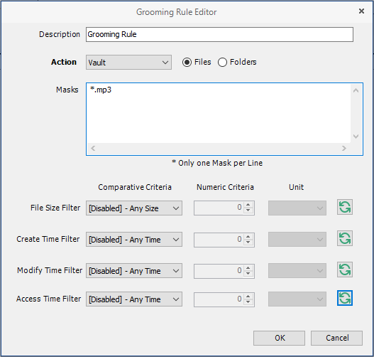 For example, if you select Greater than from the File Size Filter drop-down menu, enter 2 as the Numeric Criteria, and select MBs as the Unit setting, the grooming rule in this example vaults all MP3 files greater than 2 MB. Setting additional filters narrows the scope of the grooming action even more.