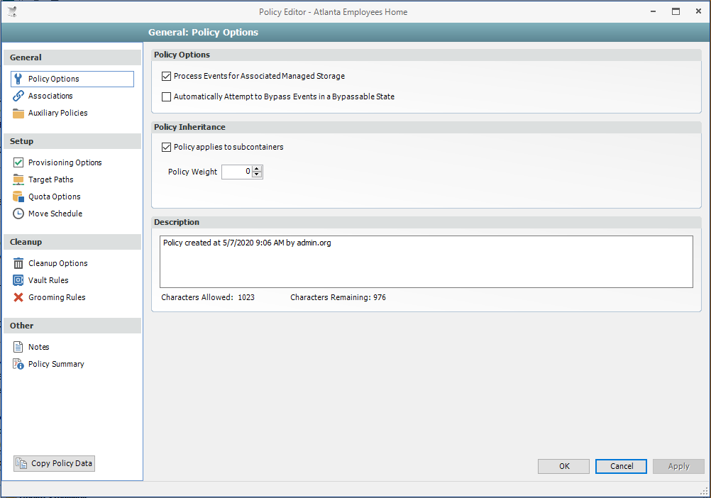 A policy is the means by which Storage Manager for eDirectory provisions, manages, deletes, and archives storage. The parameters within the policy dictate where user storage is created, what rights are granted, what quota to assign, what to do when a user is deleted, and much more.