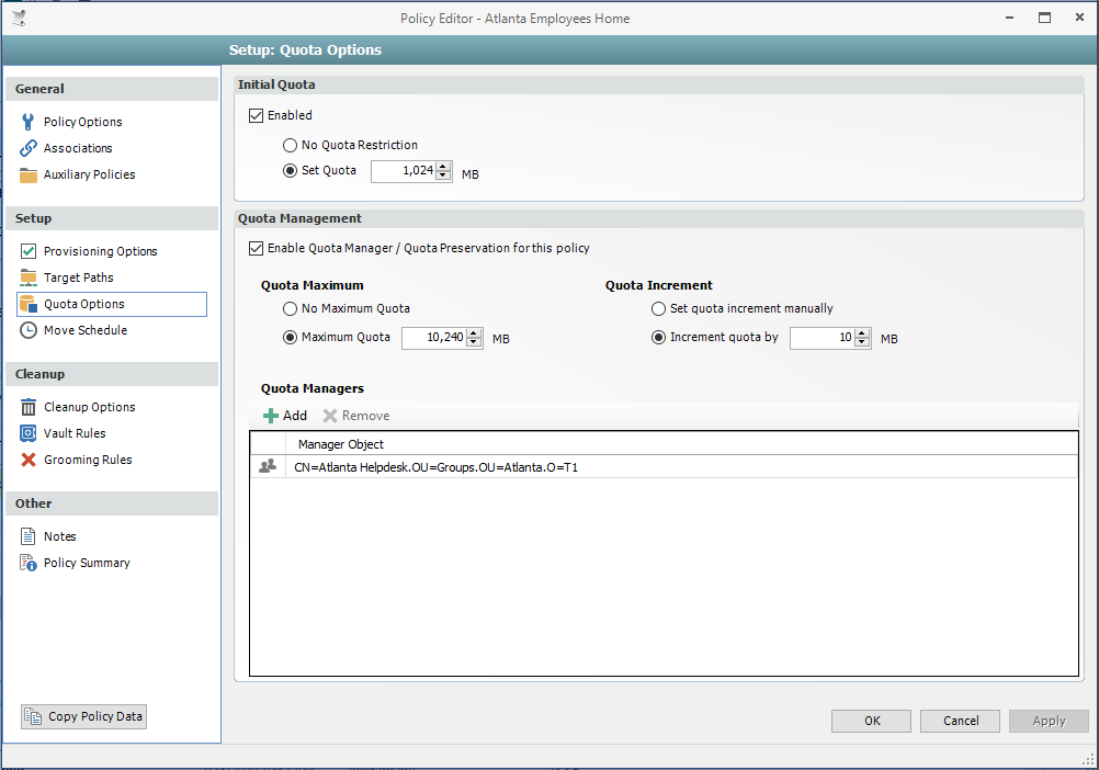 (Optional) In the Quota Management region, click the Enable Quota Manager / Quota Preservation for this Policy check box, to display additional options.