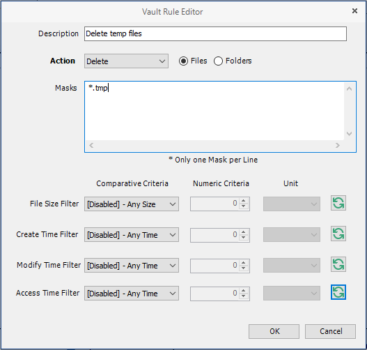 For example, in the rule above, all .tmp files are deleted prior to their home folder being vaulted. When the specified number of days in the Cleanup storage after field has passed, the home folder is deleted from the specified vault location.