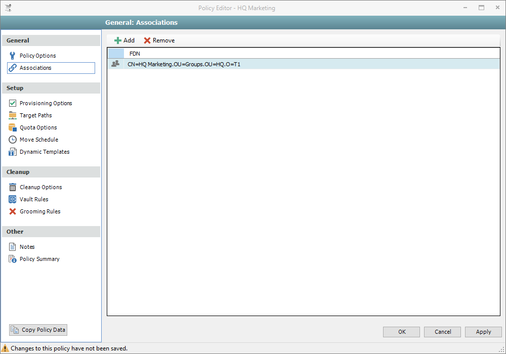 After you assign a managed path, the next step is to create a collaborative storage policy for the group or container you selected in Step 5. In this procedure, the Collaborative Storage policy will apply to the Group object. However, a Collaborative Storage policy can apply to a Group's parent container thus making it applicable to all existing and new groups located therein.