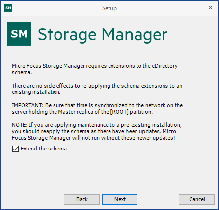 If you plan to manage collaborative storage or auxiliary user storage, extend the eDirectory schema by verifying that the Extend the schema check box is selected and click Next.
