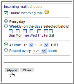 Select the type of schedule you want to use for checking the posting e-mail accounts. You can configure the schedule for a specific time of the day or a regular frequency.
