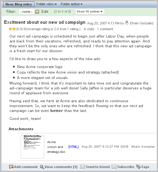 When you first view a blog folder, Novell Teaming displays all entries, from the most recently authored to the oldest (reverse chronological order).