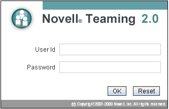 When you first install Novell® Teaming, the Teaming administrator username is admin and the password is admin. When you first log in to the Teaming site as the administrator, you should change the administrator password from the default password to a secure password of your own choosing. If you followed the instructions in Accessing Your Basic Teaming Site as the Site Administrator