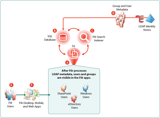 After the metadata is processed for users and groups, ESN users can see them in the ESN apps (Letter G). |
