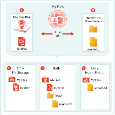 My Files is an optional personal storage area that you can make available to your ESN users. It can include two possible data storage locations, as illustrated in Figure 9-1 and explained in the table that follows it.