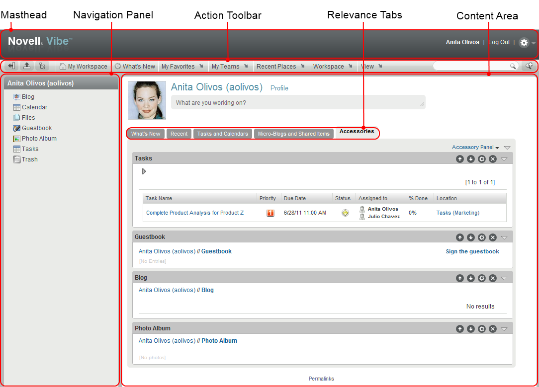 Figure 4-1shows the various areas of the Vibe interface. The type of files that you need to modify in order to affect Vibe styles depends on the area of the Vibe interface that you want to customize, as shown in the following table.